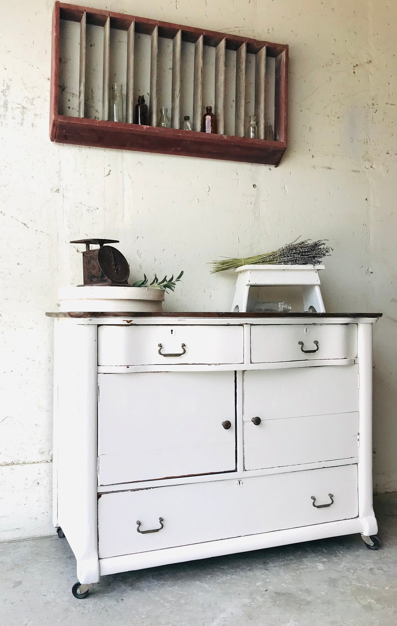 Pretty antique farmhouse rolling storage buffet, island, or coffee bar