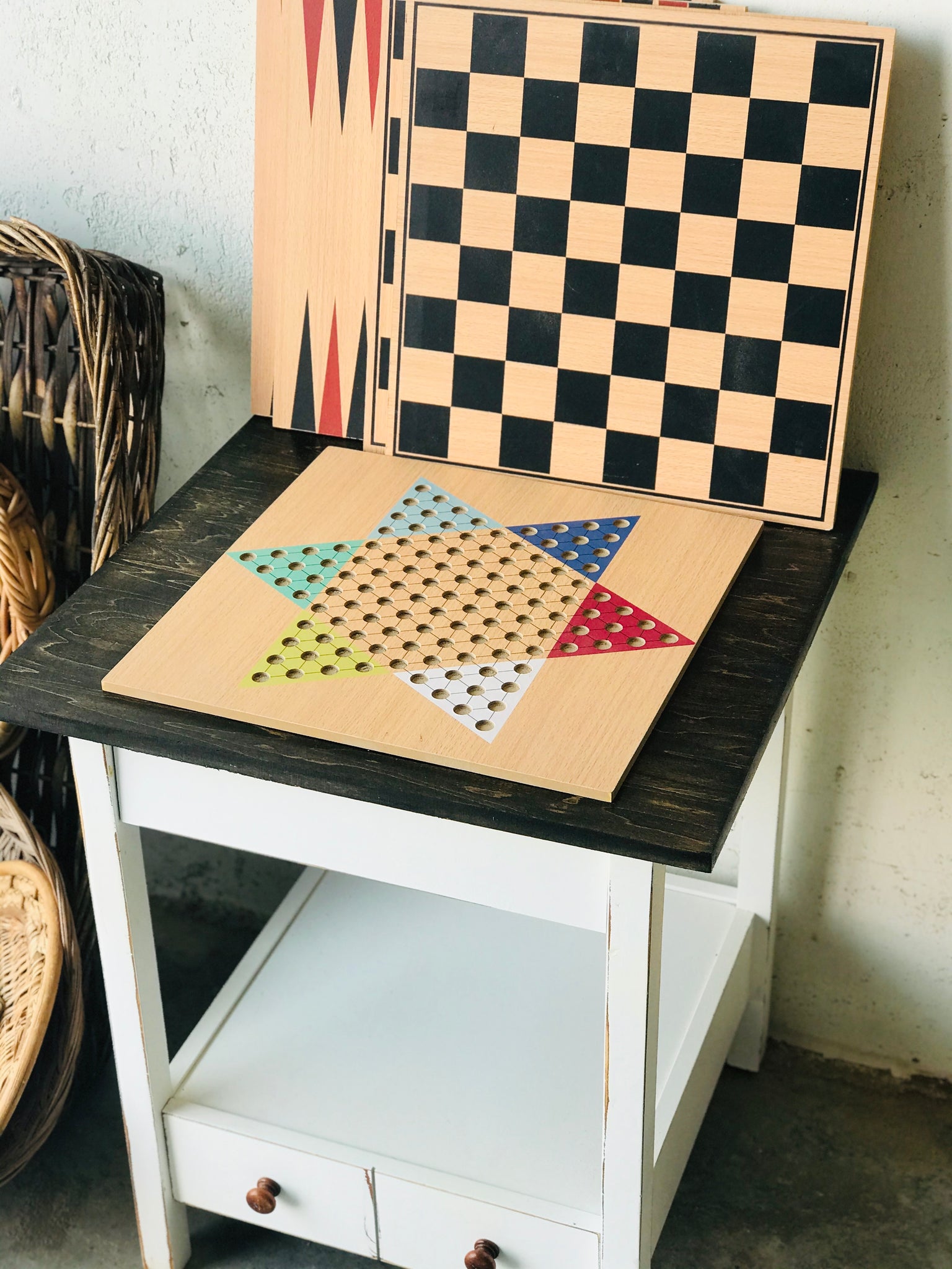 •Hidden top drawer with game boards inside (2 checkers, 2 backgammon, 1 chinese checkers)