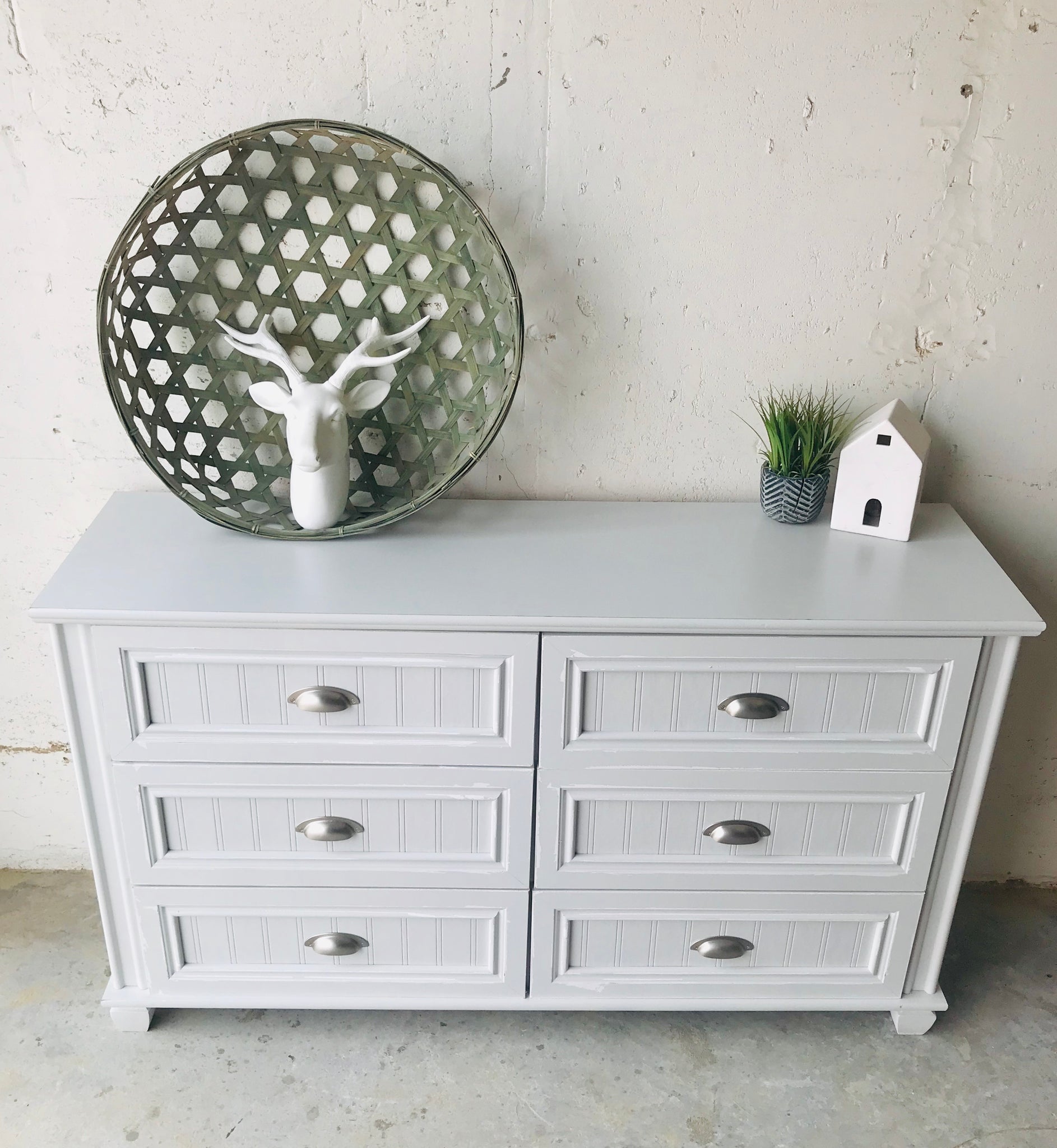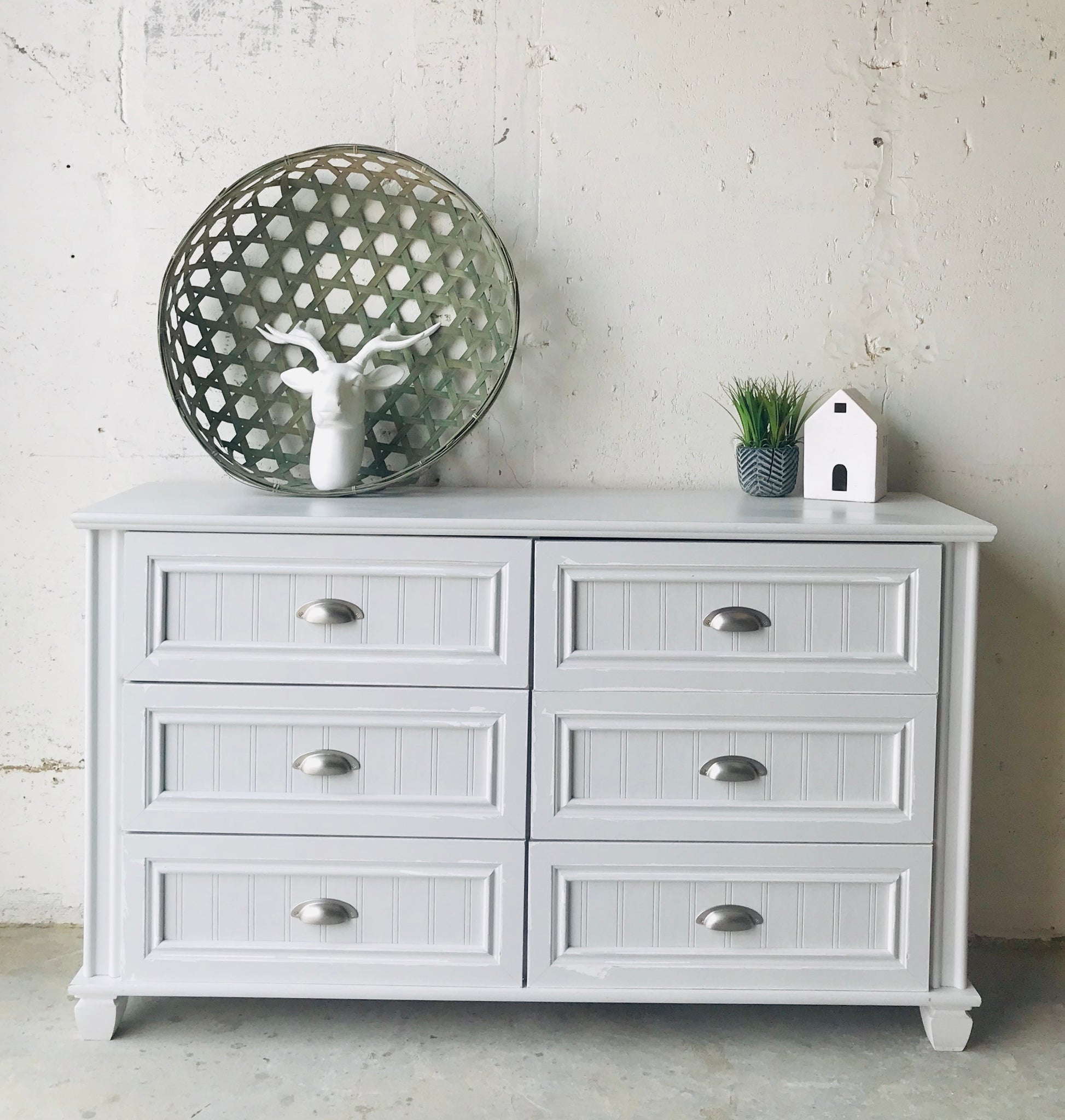•Distressed & chippy “Elemental” off-white/ultra light gray finish
