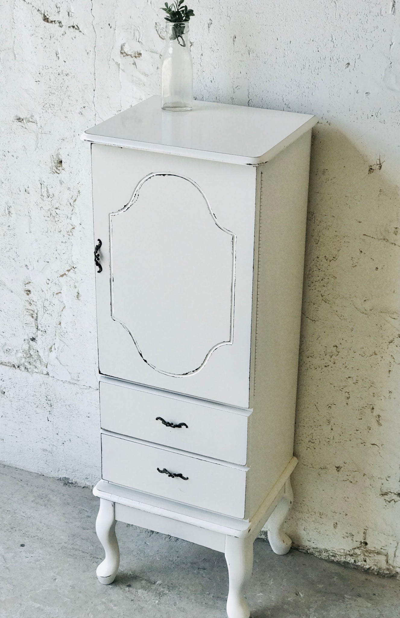 •Distressed antique white finish