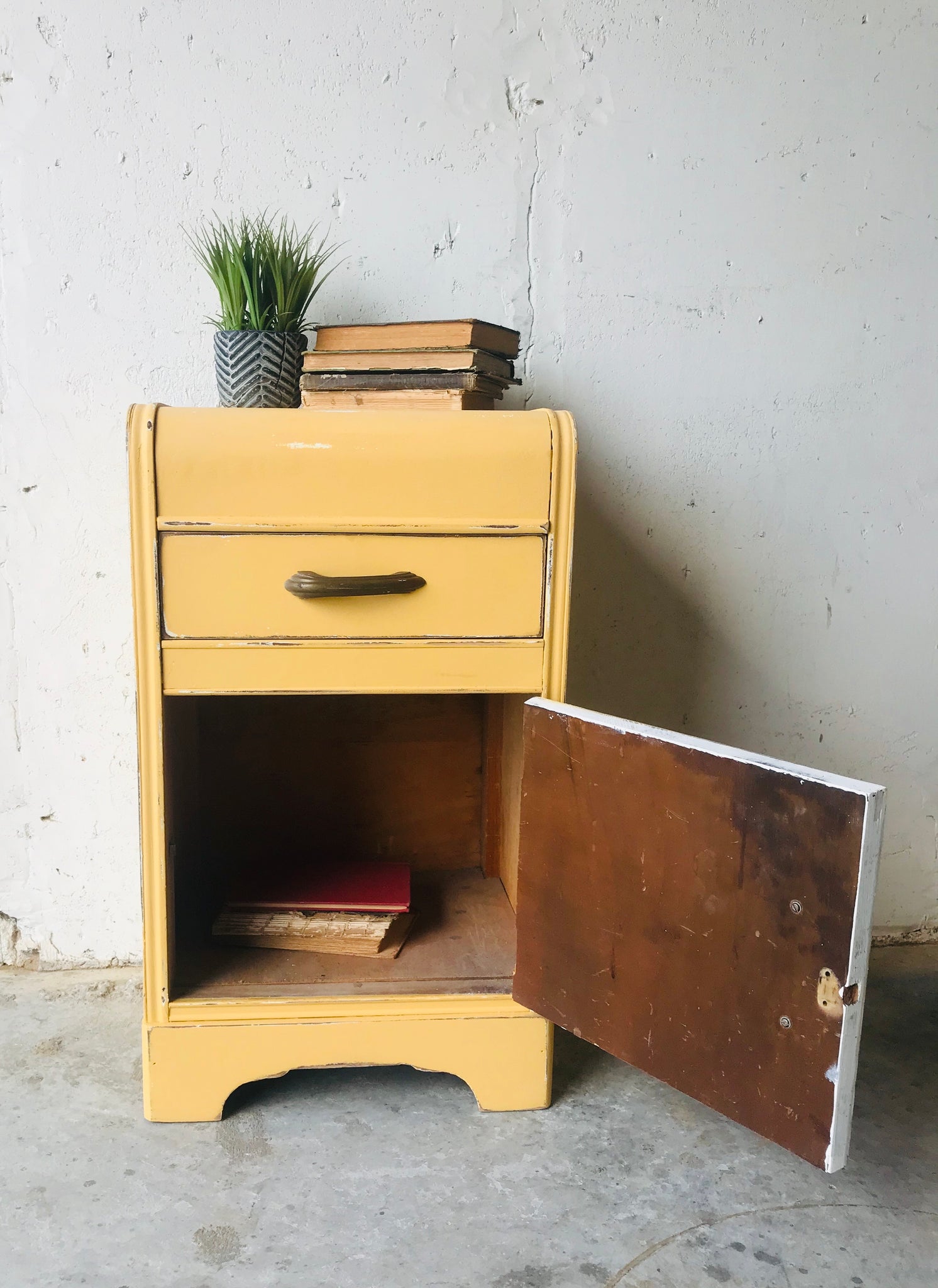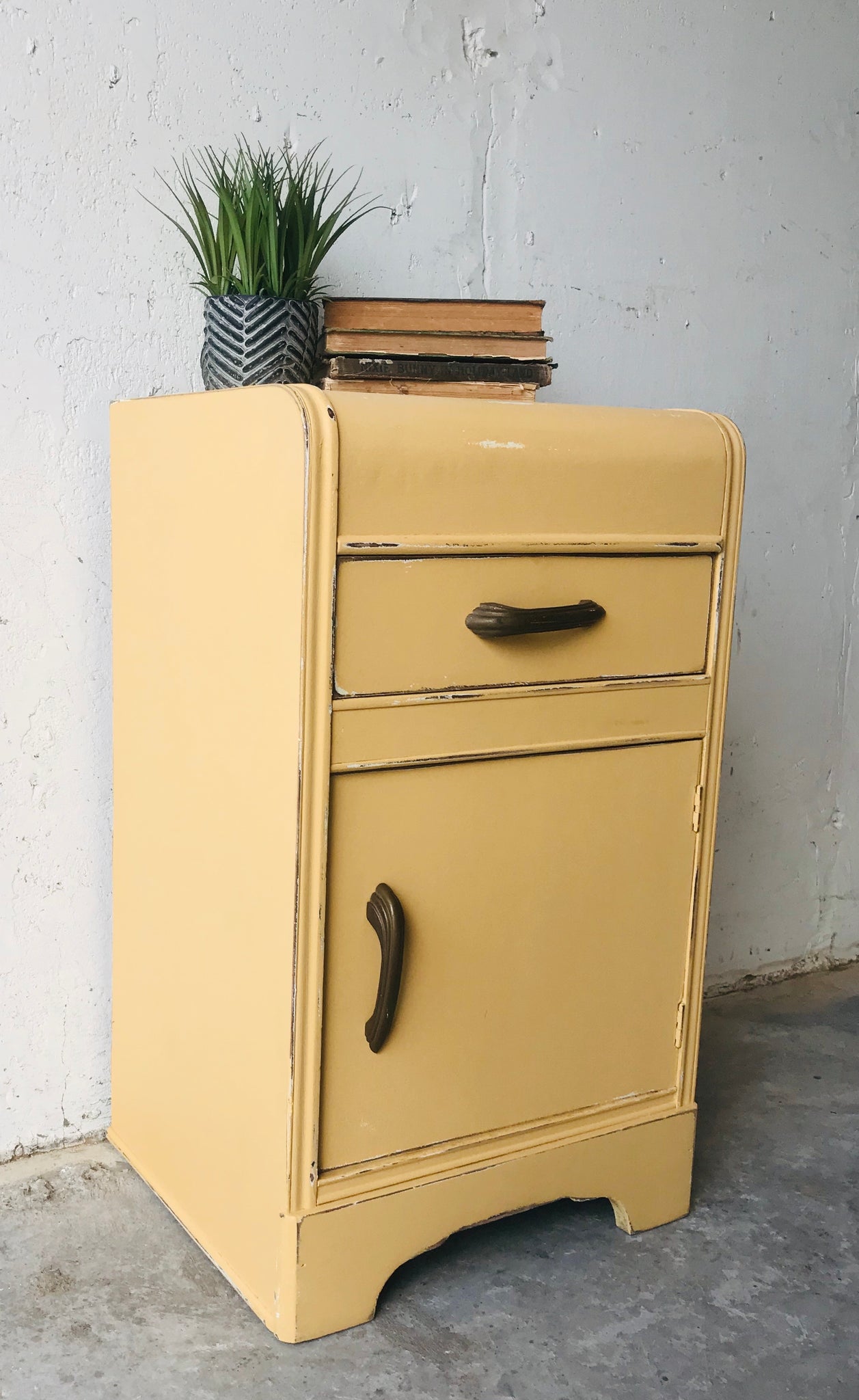 •Distressed “Lamplit” mustard yellow finish